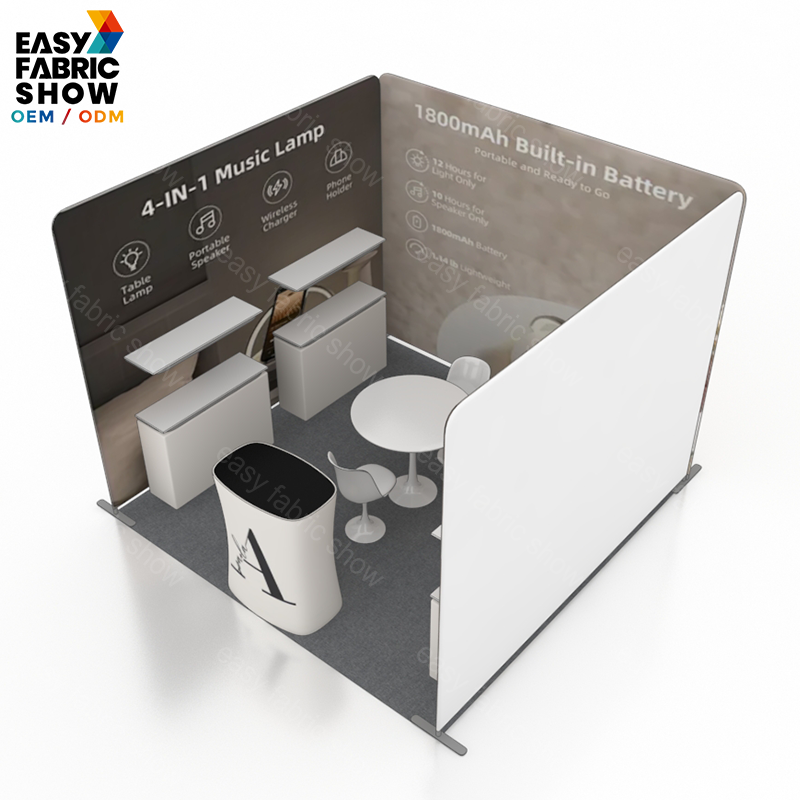 This 3x3m aluminum frame booth features a sturdy and lightweight structure ideal for versatile exhibition setups. Equipped with a multi-layer shelf, it offers efficient storage and display options to organize materials neatly and accessibly. Designed for quick assembly and durability, this booth supports professional presentations while optimizing space usage. Perfect for trade shows, retail events, and promotional activities requiring reliable and functional booth solutions.