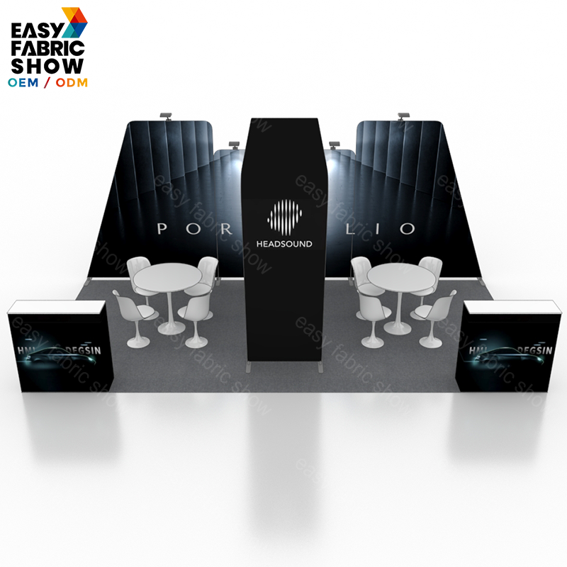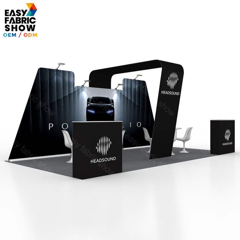 This 3x6 meter aluminum frame booth features a sleek arc-shaped design that maximizes visual impact while maintaining structural stability. The tension fabric graphics fit smoothly over the frame for a professional, wrinkle-free appearance. Integrated TV mounts enhance your presentation capabilities by allowing seamless multimedia displays. Ideal for exhibitions and trade shows, this booth combines durability with easy setup, offering a versatile and attractive solution for your marketing needs.