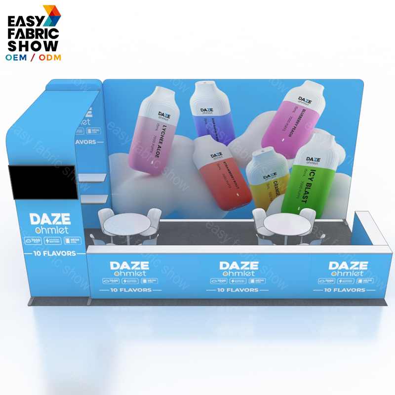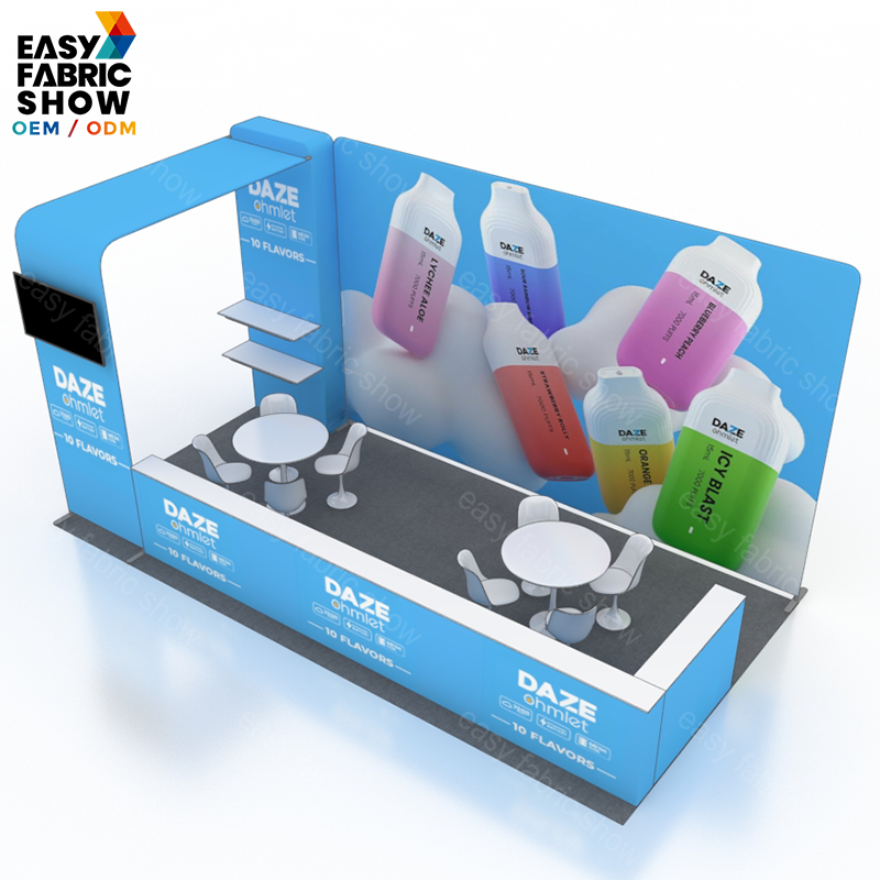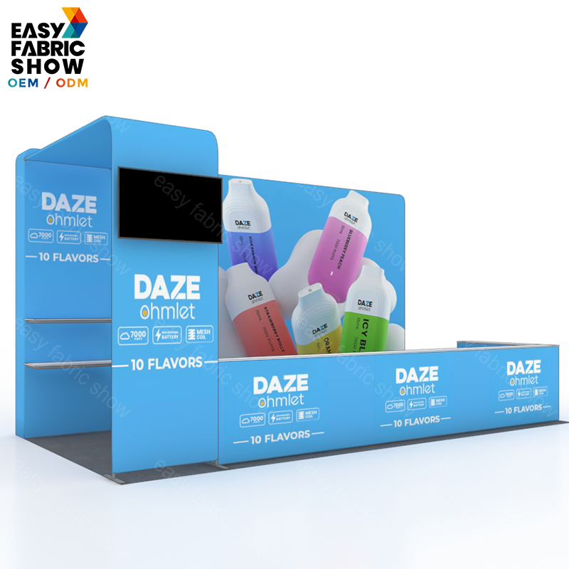 This 3x6 meter aluminum frame booth features a sleek arc-shaped design that maximizes visual impact while maintaining structural stability. The tension fabric graphics fit smoothly over the frame for a professional, wrinkle-free appearance. Integrated TV mounts enhance your presentation capabilities by allowing seamless multimedia displays. Ideal for exhibitions and trade shows, this booth combines durability with easy setup, offering a versatile and attractive solution for your marketing needs.