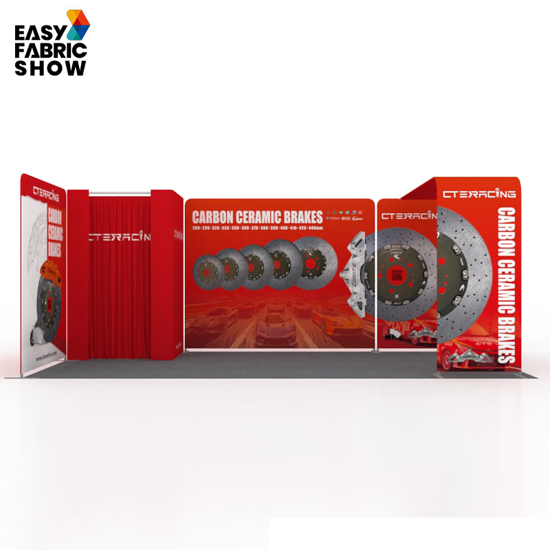This 3*6m aluminum frame booth offers a sturdy and lightweight structure ideal for exhibitions. Designed with an integrated fitting room, it provides privacy and convenience for demonstrating apparel or products. The durable aluminum frame ensures easy assembly and transport, making it a reliable choice for professional trade show displays and events.
