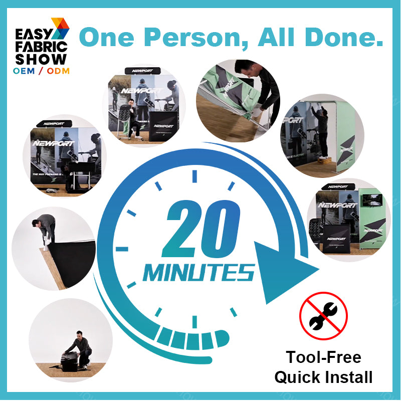 Includes multiple printed fabric backdrops with cotton bags for flexible branding and easy transport