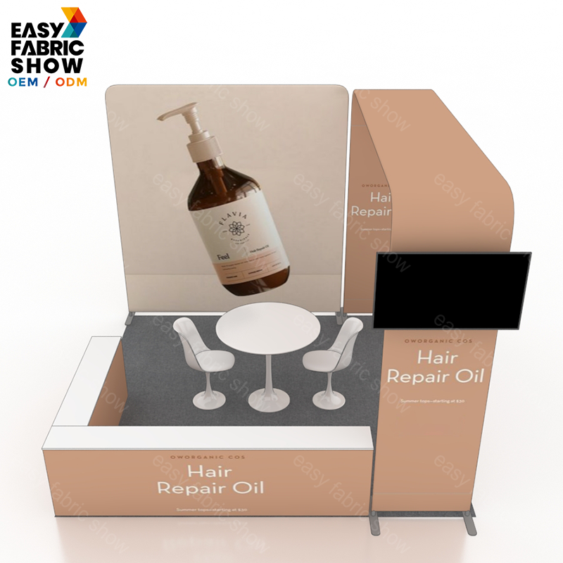 This high-resolution printed custom expo booth combines striking visual appeal with practical design. Featuring an arched TV mount, it provides optimal placement for digital displays, enhancing customer engagement. The L-shaped showcase offers ample space to present products effectively while maintaining an open, inviting layout. Crafted for professional exhibitions, this booth balances eye-catching graphics with functional elements to maximize your brand’s presence and impact at any event.